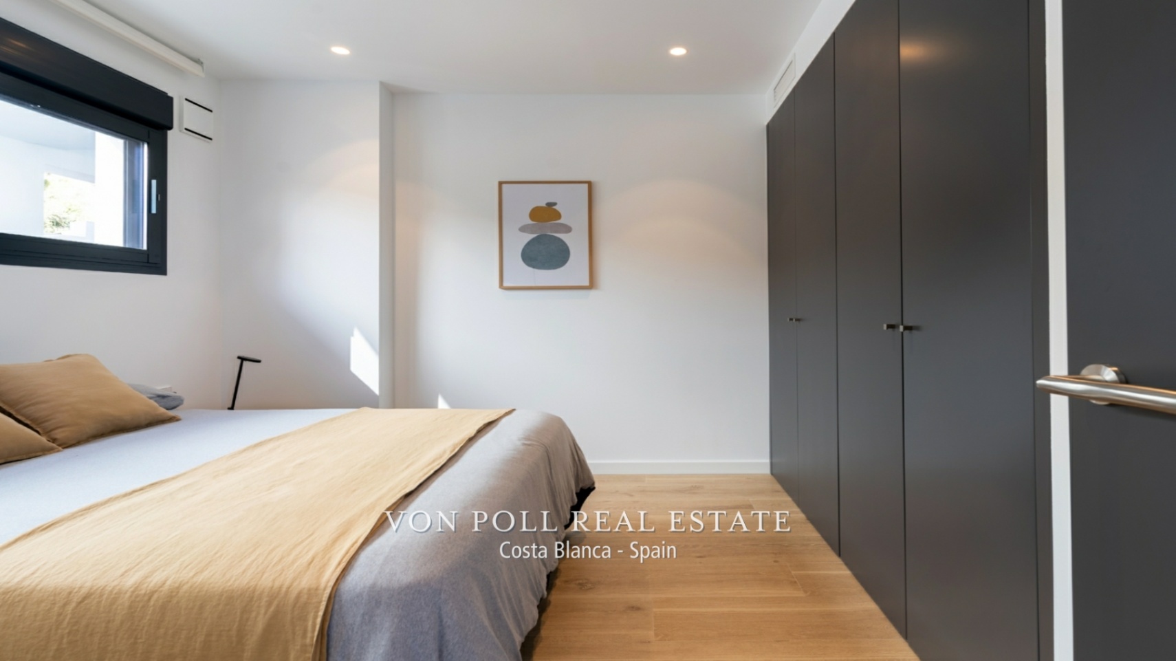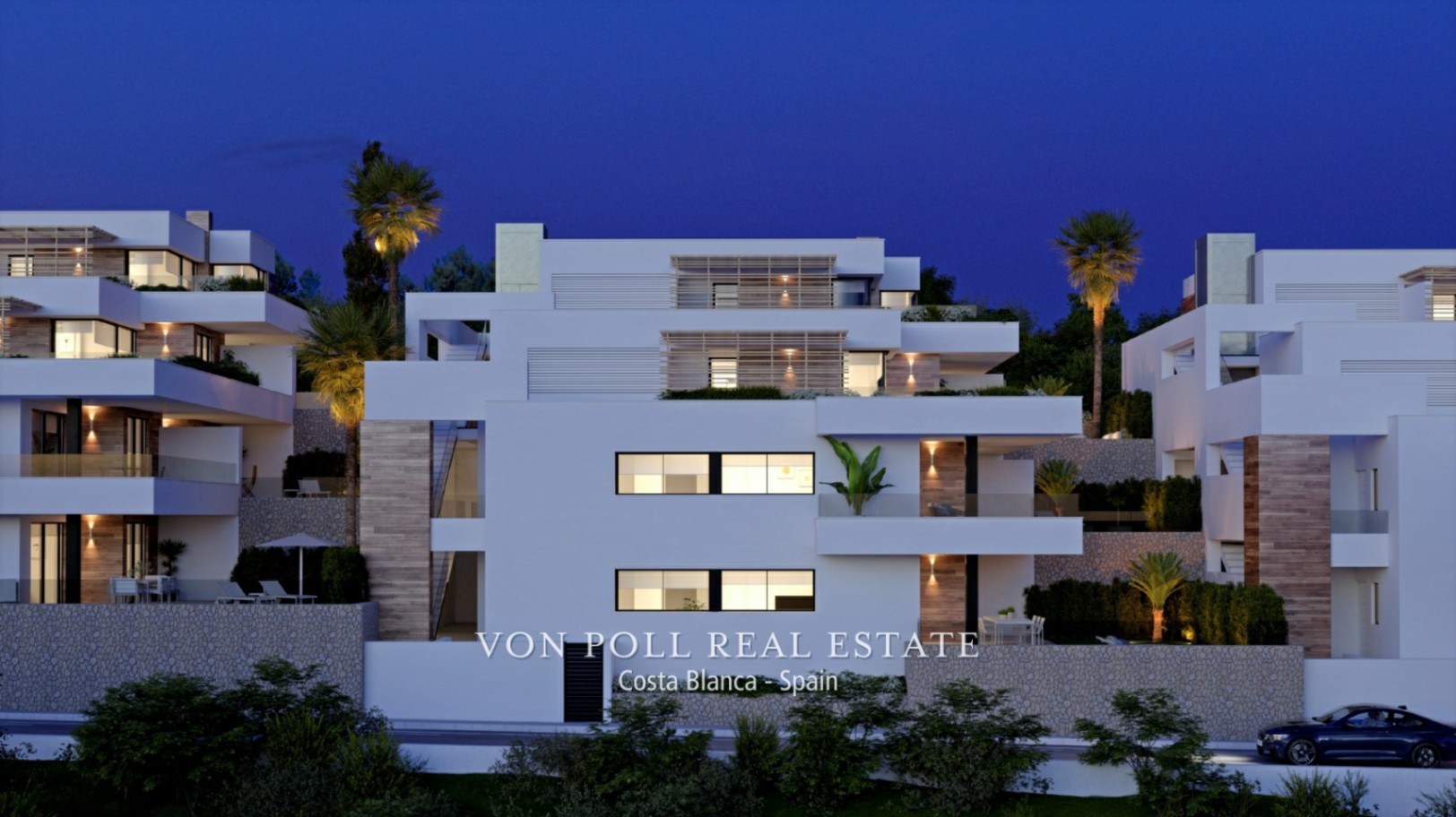 Characteristics: New Built Apartments: These are newly constructed apartments. Modern Architecture: The apartments feature modern architectural design. Bedrooms and Bathrooms: Each apartment has 2 bedrooms and 2 bathrooms. Features:   Under-floor Heating: The presence of under-floor heating is a comfort feature.  Open Kitchen: The kitchen is open to the living room, which is a contemporary design choice. Ground floor apartments have a terrace and garden, while top floor apartments have a solarium. Comfort Features: The apartments are equipped with under-floor heating, hot and cold air conditioning, a hot water system, electrical appliances, and a decoration project to enhance style and warmth. Air Conditioning in the living room. Hot Water System: Hot water is supplied through the Altherma system. Appliances Included: Electrical appliances are included, which is convenient for residents.  Communal areas are designed for relaxation and family enjoyment, featuring a pool, large terraces for sunbathing, a playground for children, a social club, gardens, and parking areas. Area: The apartments are located within a short distance to Cala del Llebeig, the urban core of Moraira, and all the services that Residential Resort Cumbre del Sol offers. The mention of the proximity to a cove (Cala del Llebeig) and the urban core of Moraira indicates that the location is likely in a coastal area with access to essential services. The location is also described as convenient for access to amenities and natural features like Cala del Llebeig. Aerport Alicante one hour drive Commission free for buyer! Von poll costa blanca