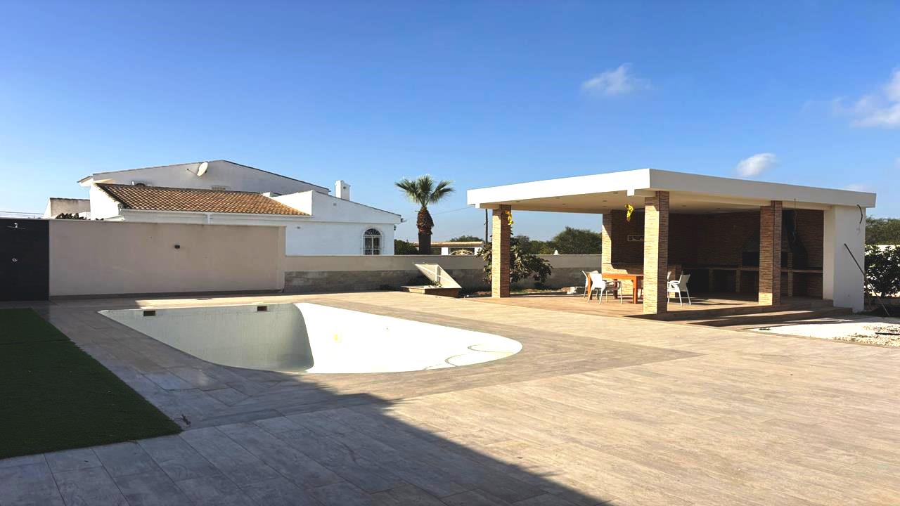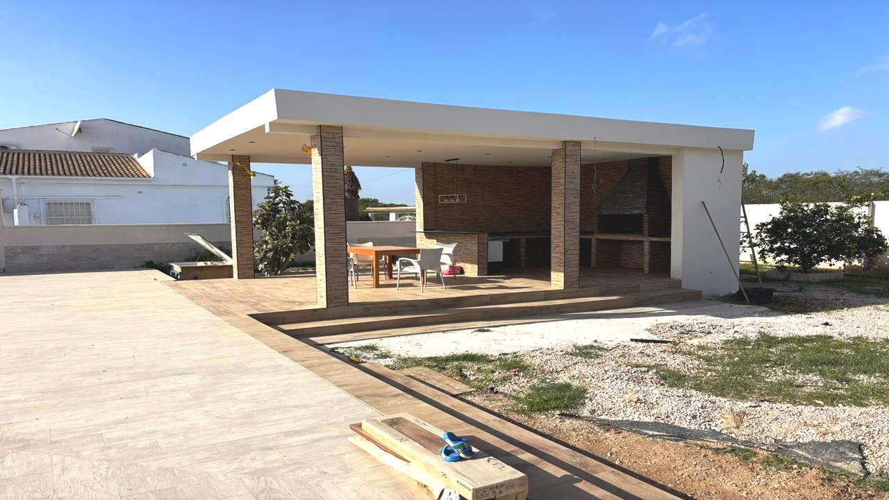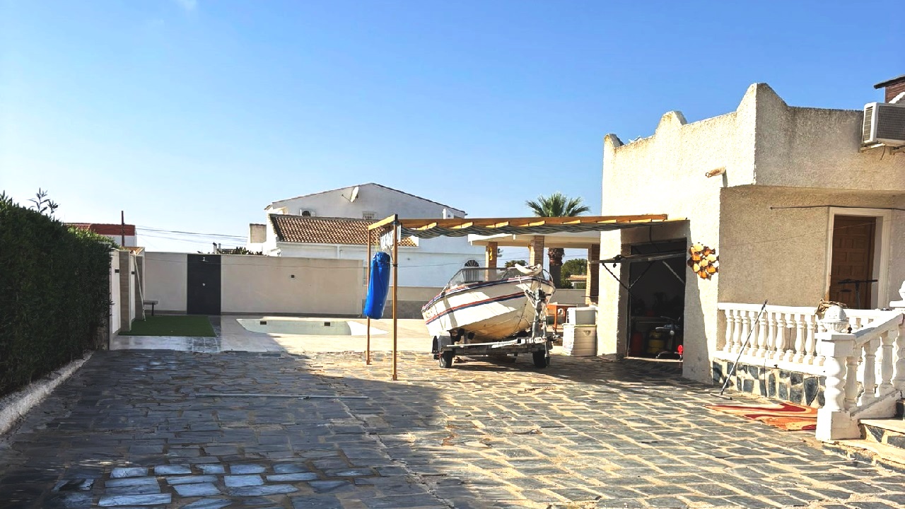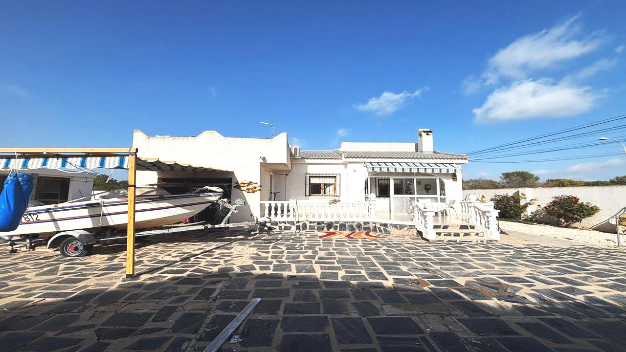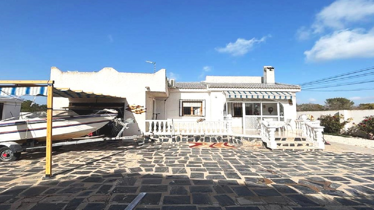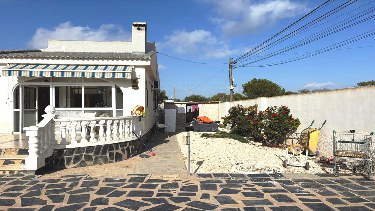WTi2113 — Torrevieja (El Chaparral) – 2 Bedrooms Detached Villa with Pool, Kitchen/BBQ, Garage and Solarium. - White Villas in Spain presents this wonderful Detached Villa on a spacious 1,000m² plot where every corner invites you to imagine unique moments. From the moment you step inside, you'll be greeted by a large garden and a brand-new pool, ideal for cooling off and enjoying sunny days. Next to the pool, you'll find a spectacular, brand-new gazebo with a built-in barbecue, perfect for gathering family and friends for long evenings outdoors. The property, of approx. 75m², combines comfort and warmth. Upon entering, you're welcomed by a bright living room with a kitchenette, two bedrooms, and a functional bathroom. Outside, a staircase leads you to the private solarium, with stunning views of the unique Pink Lagoon, a natural setting that will make every sunset unforgettable. In addition, the plot offers great potential to design new rooms or garden areas according to your tastes and needs. Check it out on our WhiteVillasInSpain site. Looking for something more? This villa gives you the possibility of building a second floor, further expanding the space and potential of the property. Whether you want to create your ideal home or take advantage of this opportunity as an investment. Council tax: €270 per year and there are no community fees.