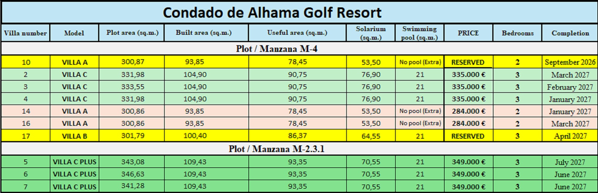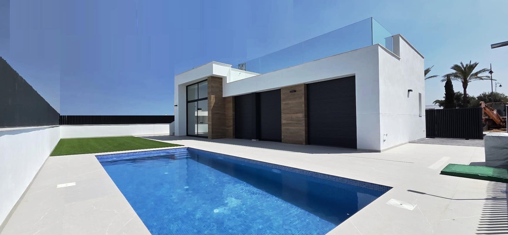 Ref: WV2532 -- Condado de Alhama (Murcia Region) - 2 and 3 Bedrooms NEW Build Villas with Pool, Off-Road Parking and Solarium. - White Villas in Spain presents this residential complex of One Floor independent Villas with 2 or 3 bedrooms, 2 bathrooms, a Pool, a private roof Solarium and a Car drive in the private Garden. 3 Different Models of Villas available: - Villa A: 2 bedroom and 2 bathrooms (Private Pool is NOT included but it is an extra). * PRICE: 284,000 € * - Villa C and Villa c plus: with 3 bedroom and 2 bathrooms (7X3 m. Private Pool is included). * PRICE 335,000 € * - Villas C Plus are the largest, with the main entrance at the front of the dwelling, just by the car drive and the swimming pool. * 349,000 € * Included in the price of the Villa: - Private parking in the garden made of printed concrete. - Bathrooms: shower screens, vanities, wall mirrors and lighting with LED ceiling lights. - Kitchen: extractor and LED ceiling lights. - Pre-installation of air conditioning. - Lined built-in wardrobes. - Electric shutters. - Aerothermal system. - Water softener. - Charging point for electric or hybrid vehicles. - Plot: Led area around the house and the swimming pool, artificial grass in the remaining garden. - Solarium: it is covered with artificial grass partly. Also included water & electricity points.